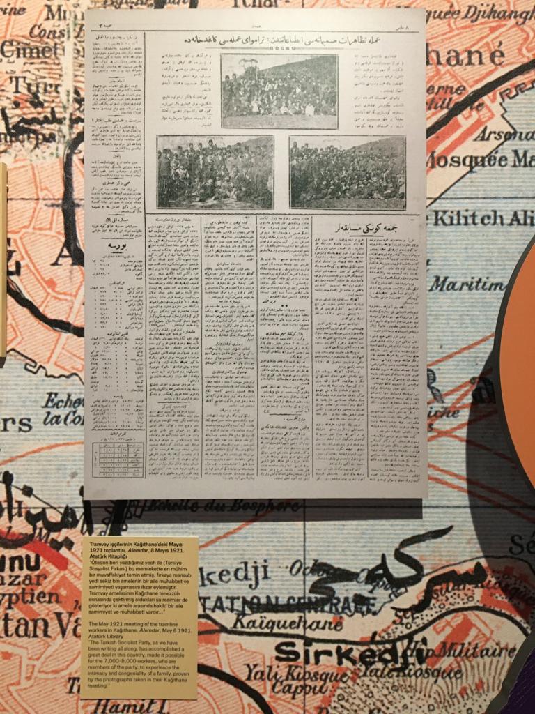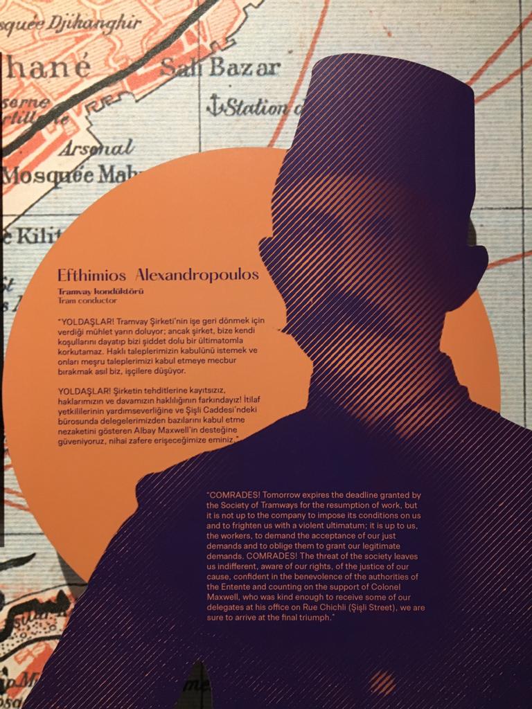 Panodaki belgelerden, “tramvay işçilerinin Kağıthane’deki Mayıs 1921 toplantısı”nın 8 Mayıs 1921 tarihli Alemdar gazetesinde yayımlanmış haberi ve Efthimios Alexandropoulos isimli bir tramvay kondüktörünün “YOLDAŞLAR! Tramvay Şirketi’nin işe geri dönmek için verdiği mühlet yarın doluyor” cümlesiyle başlayan sözleri hem bu bilgiyi destekliyor hem de başlı başına araştırma ve yorum hak ediyordu.