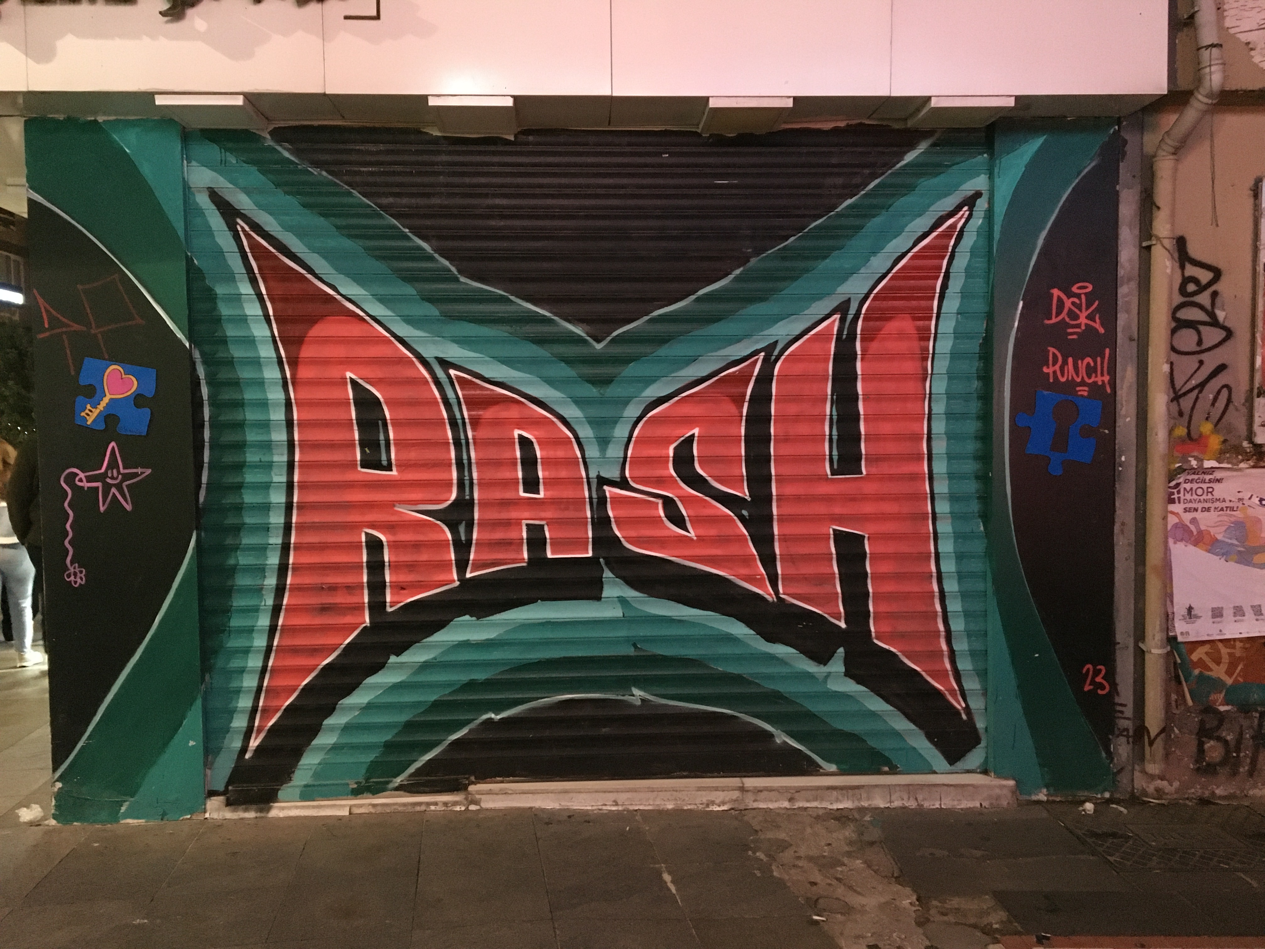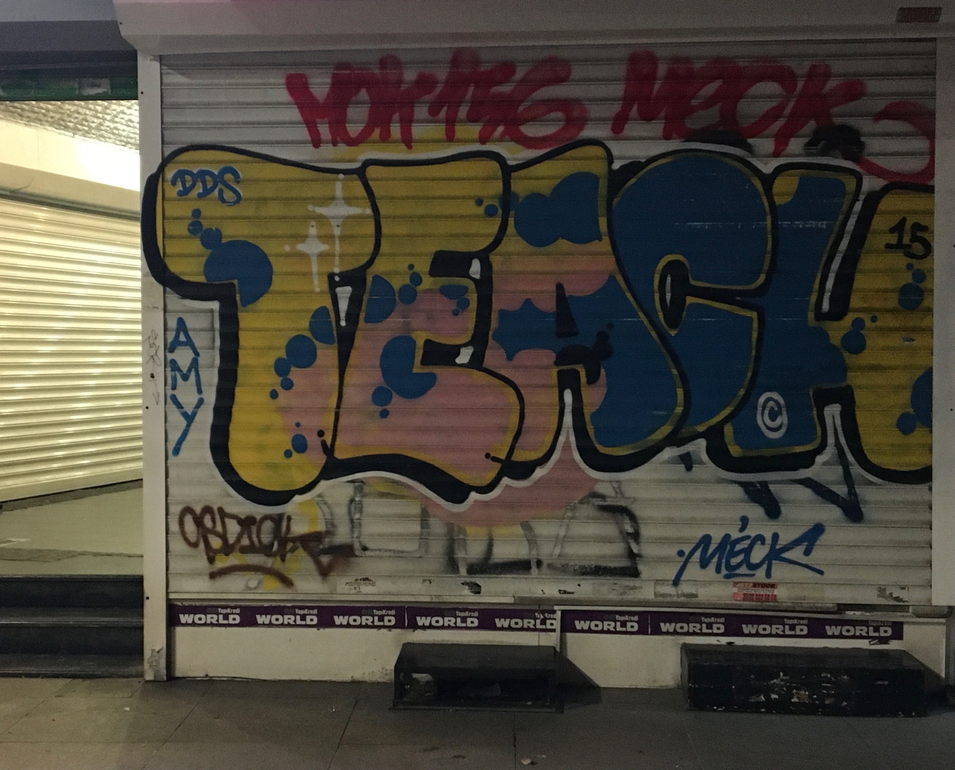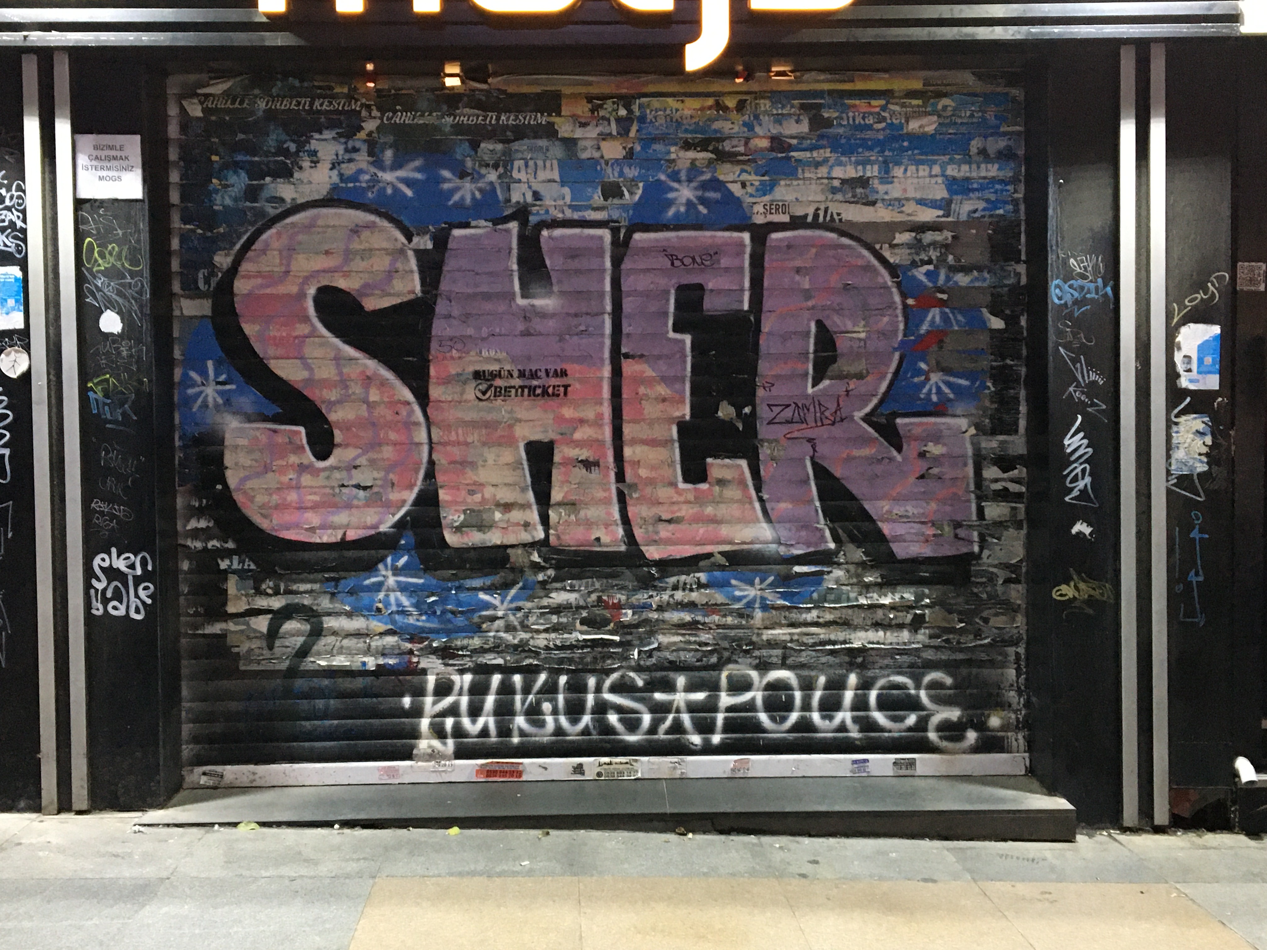 Sonra yol boyunca kapanmış dükkânların/büfelerin kepenklerine yazılmış/çizilmiş olanlar eşlik etmeye başlıyor iki yanımda.